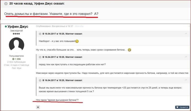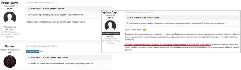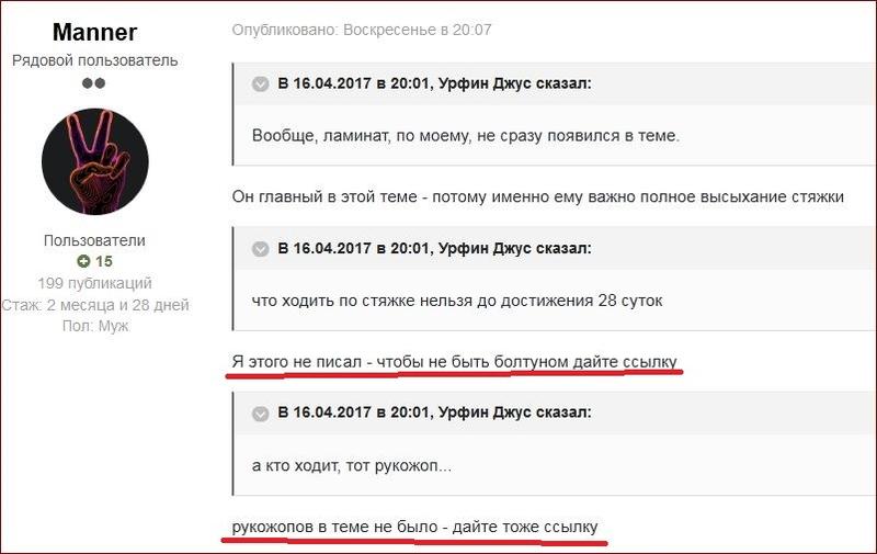 Опять по себе судите? Я ж недавно писал что вы и были инициатором и сейчас такая же история: недавно после вашего признания с ошибкой с ламинатом я думал наш диалог закончился, но вы опять появились со своими бредовыми мыслями про мою занятость, цены и т.д. Нужно ли было вчерашнее ваше сообщение про словесную шелуху и прочее - может было лучше было не отвечать чтобы не начинать сначала? и это по вашему не хамство назвать меня зацикленным болваном? Подведем итоги: 1) вы халтурщик потому что допустили укладку ламината на 14-дневную классическую "мокрую" стяжку; 2 вы халтурщик потому что поддержали сообщение халтурщика Sashi2001; 3) вы халтурщик потому что не знаете что такое "время высыхание бетона" 4) вы халтурщик потому что называете безукоризненной работой, работу которая этом не соответствует 5) вы болтун потому что так и не дали мне ссылок на мои 2 эти вопроса: 6) я в отличии от вас на ваши просьбы предоставить ссылки предоставил: а) и 7) если уж пошел такой откровенный разговор, то напишу то что не хотел писать, а речь о другой теме в этом разделе с этим сообщением: Тем пользователем о котором я писал в той теме и в которого не хотел тыкать пальцем как раз и является Урфин Джус. Просматривая темы других отделочников я несколько раз натыкался на его сообщения в рекламных темах других пользователей форума. Вот скрин например с темы пользователя Бадмаева Алексея: а вот и его тема: Кому как, но я считаю подобную саморекламу в рекламных темах других форумчан некорректной и так не должно быть! Зайти скажем так почти к конкуренту, разместить 8 фотографий это перебор! И такое его поведение не только в этой теме, а во многих других. Как это назвать то? P.S. О вашем знакомом не сейчас