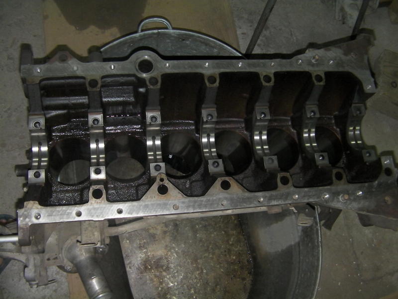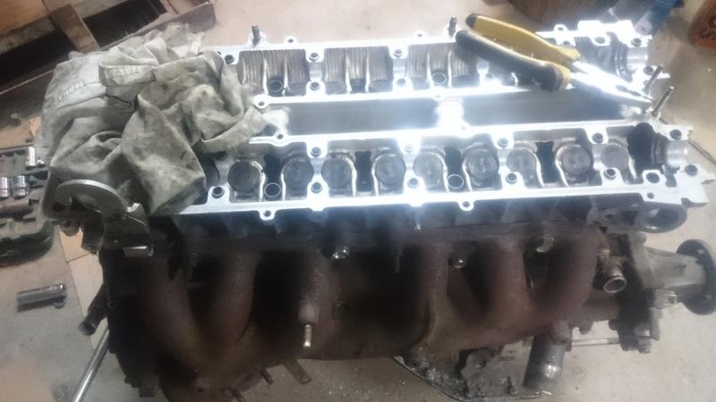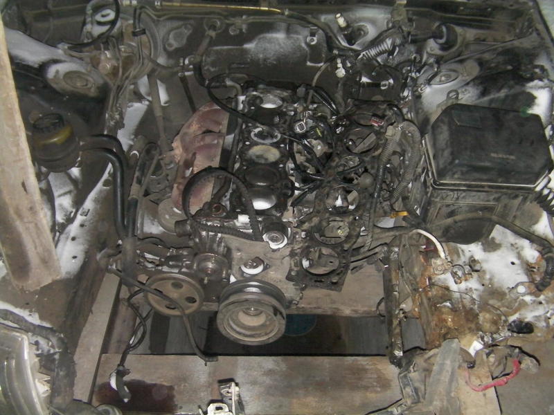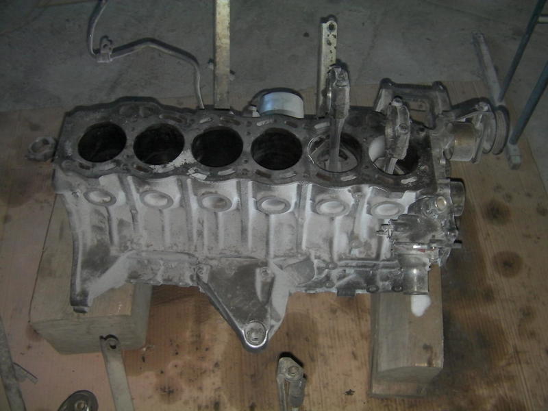 Пока в состоянии "ведро" - чего только нет: капота нет, фар нет, бампера нет, крыльев нет, и мотора тоже нет Этот марк когда-то, в начале тысячелетия, приплыл в нашу страну свежайшим двухсполовинойлитровым овощом, чуть позже приобрел турбины и превратился в низколетающую полуторатонную пулю. Немыми свидетельствами вэшного прошлого пока еще остаются нагромождение тормозных трубок и игнитор на левой чашке. Трехлитровый блок уже принял ванну и нежится под лучами ламп дневного света кверху пузом а вот и то что в сердце самого сердца - вот такая мудреная тавтология. Сверху уже точеный и отшлифованный 3-литровый, а внизу от стукнувшего 2,5-го джея.