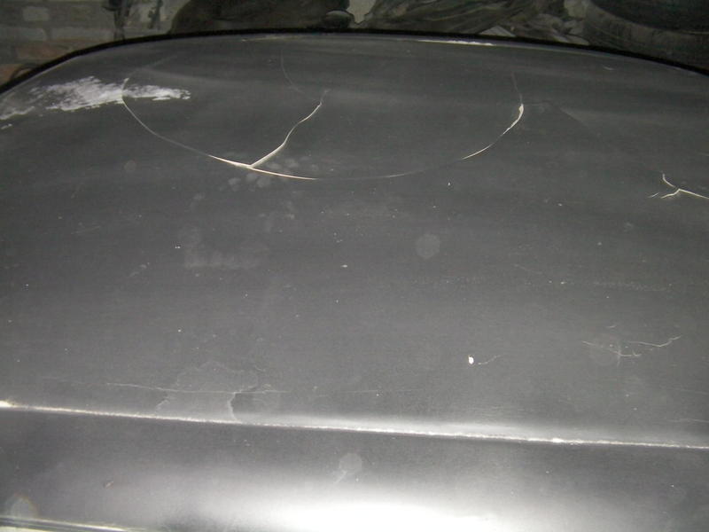 на мятом капоте следы ботинок. в итоге офигенно выправлен. вывод - править железки надо ногами, в ботах с рифленой подошвой!