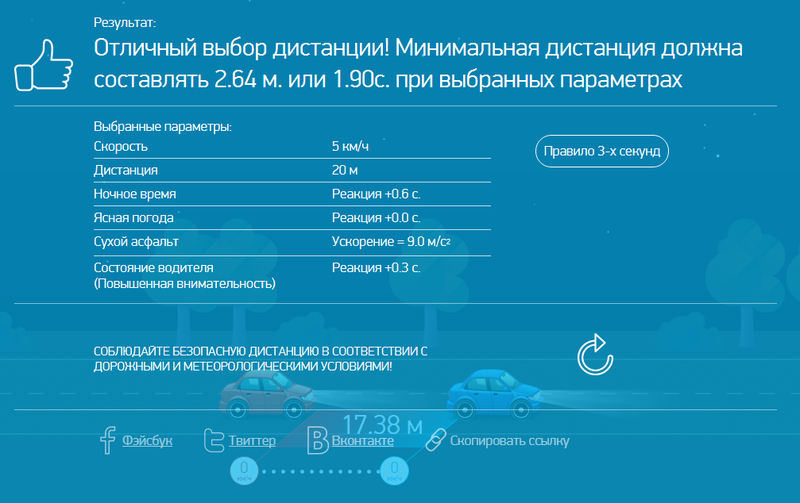 К чему спорить, когда @Lurdes.com на Трубачеева утром не ездит? Приводит примеры расчетов, про математику говорит, хотя из сообщений выше делаю вывод, что образование далеко от математического. Больше смахивает на один изместный форум, где каждый посетитель бредит именно такими утопическими примерами. Хотите заняться расчетами? Пожалуйста! https://bezdtp.ru/bezdtp/ru/calculator Проецируем дорожную обстановку, вводная: 7:40 утра, буднее утро, скорость потока 5-10 км/ч, сухой асфальт. Все это и выбираем в калькуляторе. Уточню, что помимо этого проставил "Состояние водителя" как "Повышенная внимательность" ибо я за рулем ворон не считаю и на вывески красивые внимания не обращаю. Отвлекающих факторов нет, опять же потому что я управляю средством повышенной опасности и должен максимально концентрироваться на дорожной ситуации. Итого скрин: Жмем поехали и смотрим результат: Т.е. мне, как эталонному водителю, необходимо 3 метра дистанции. Можете по выбирать разные варианты на свой вкус, но выше 5-7 метров не получится увидеть. О чем это говорит? Дак о том, что "спящие красавицы" с дистанцией в 4-5 корпусов (а это и есть 20-25 метров) - порождение замедления потока! О какой плотности здесь может идти речь, когда впереди потока из 20 машин неуверенное существо, тормозящее всех? Да еще и не одно, а несколько! Более того, на "улице ста колодцев" нет разметки и разделением потоков считается центр проезжей части. Ввиду вполне вменяемых объективных факторов состояния дорожного полотна, оба потока вынуждены двигаться как можно правее (про садистов, собирающих колодцы молчу). Тем самым создавая вполне безопасный боковой интервал для опережения/обгона при таком скоростном режиме (т.е 5-10 км/ч). Обгоняя тормоза вы уменьшаете плотность потока позади вас. По определению и вашей же логике, уважаемая @Lurdes.com , тем самым пробка позади вас рассасывается. Что и происходит ежедневно, когда в потоке адекваты. Но нет, мы же г. Улан-Удэ, у нас менталитет то иной. Завидев обгоняющего мы же не можем запустить процесс анализа ситуации, нам же нужно включать эмоции, вываливать по центру, всячески преграждать путь, мол я тут такой правильный, терплю и ты терпи. Да пожалуйста, едьте вы по своим правилам, считая ворон или глазея вывески, строча смски или общаясь со своей ненаглядной второй половинкой - я вам не мешаю этого делать. Так и вы не встревайте туда, куда не просят. Считаете, что нарушаю - сфотайте/снимите видео, оправьте на сайт ГИБДД, там разберутся. Влом это делать? Забейте болт тогда. Т.к. не решите вы тем самым основной проблемы ДД в УУ - полнейший эгоизм. Хотите ездить как вам удобно и как вам нравится - другим хотя бы не мешайте!