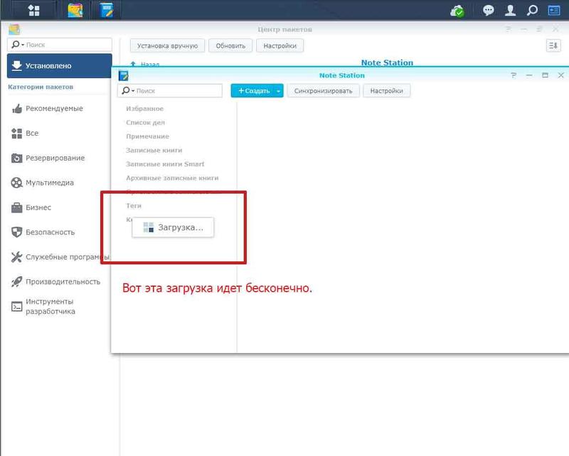 Всем привет! Имеется следующая проблема. Через веб интерфейсе DSM DS3615xs (XPEnology) установил пакет Note Station 2.6.0-1407, при запуске пакет бесконечно грузится и нет возможности работать с ним из под DSM. Но хорошо без багов работает как Win клиент так и Android клиент. Все сохраняется и синхронизируется с сервером. Переустанавливал пакет аж два раза не помогло. железо: Asus P8H77 m PRO / 8gb ram / INTEL Core i3-4130 -