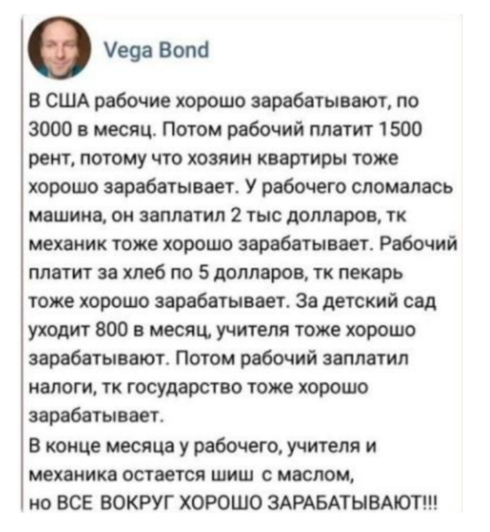 да то что жрет славик, просто не съедобное. хлеб, молоко, мясо в америке отвратительные. фрукты абсолютно безвкусные. еще и стоит для нищего славика достаточно дорого. его взгляд на америку из под плинтуса, с предельно низкой позиции, по американским и даже по нашим современным меркам славик нищий у которого вообще ничего нет. хотя способный человек в америке может неплохо устроится, но жирный бездарь не из таких.