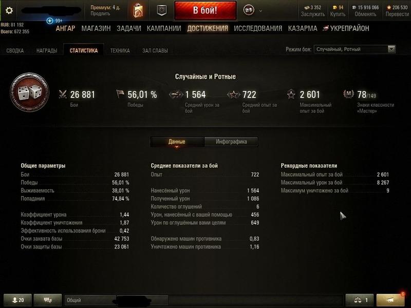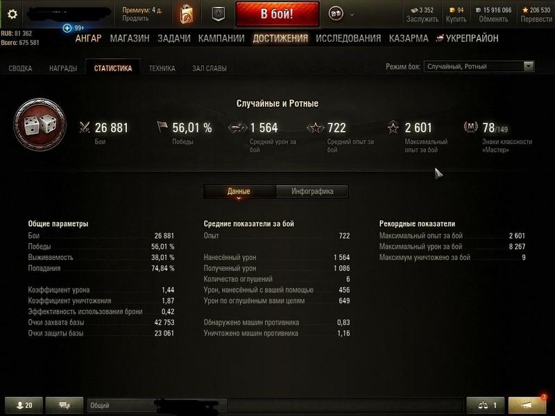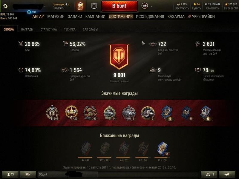 4. Продаю акк. процент побед 56+, 26 к + боев, личный рейтинг 9000+, средний урон 1560+, РЭ 1450 Свободный опыт 220 000 +, Серебра 23 миллионов Техника - 10 - ис7, т110е5, е100, Маус, хевик, т62, 140, бат чат 25 т., ГВЕ100, VK 72.01 K, STB-1, Leopard 1, Е50М, J.Pz. E 100,Centurion AX, Foch 155, Foch 50B, объект 907 из 8 ур премы - 34, Лева, ФВ4202, из 7 ур. премы - е25, Фв 201(А45), пантера/М10 и много другой техники, оборудования, снаряжения, почти на всех топах по 3-5 перков, Цена - 7 тыс. руб.