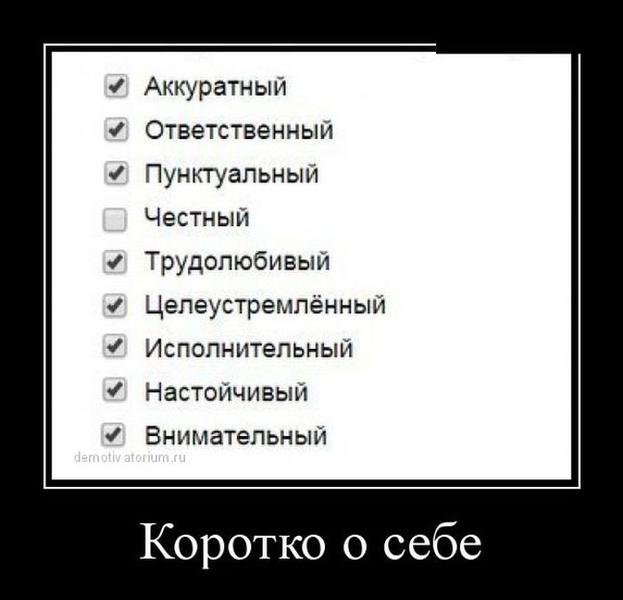 Если вы можете: – начать свой день без кофеина; – быть жизнерадостным и не обращать внимания на боли и недомогания; – удержаться от жалоб и не утомлять людей своими проблемами; – есть одну и ту же пищу каждый день и быть благодарными за это; – понять любимого человека, когда у него не хватает на вас времени; – пропустить мимо ушей обвинения со стороны любимого человека, когда все идёт не так не по вашей вине – спокойно воспринимать критику; – относиться к своему бедному другу так же, как и к богатому; – обойтись без лжи и обмана; – бороться со стрессом без лекарств; – расслабиться без выпивки; – заснуть без таблеток; – искренне сказать, что у вас нет предубеждений против цвета кожи, религиозных убеждений, сексуальной ориентации или политики, – Источник: http://fishki.net/1902624-opredelite-svoj-uroven-razvitija.html?mode=tag:jumor:recent © Fishki.net