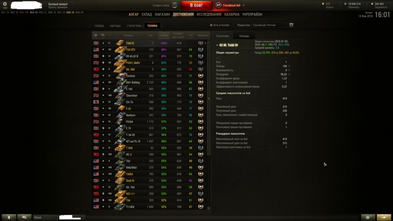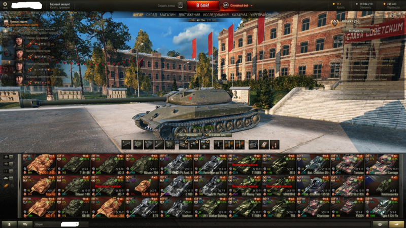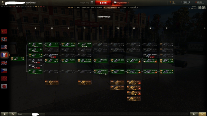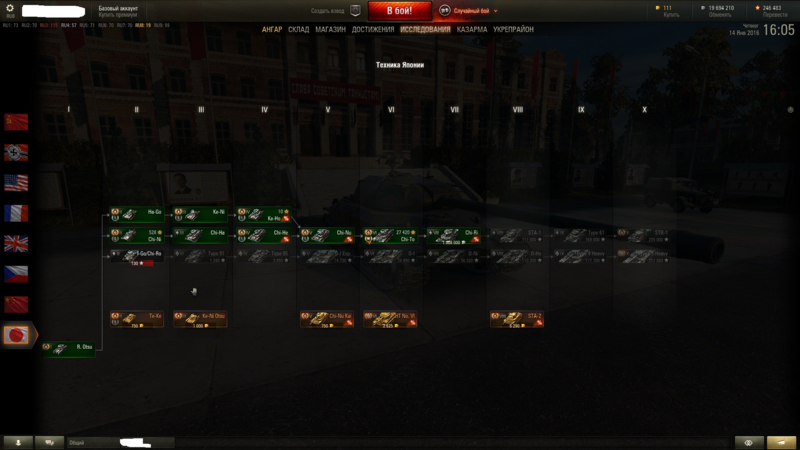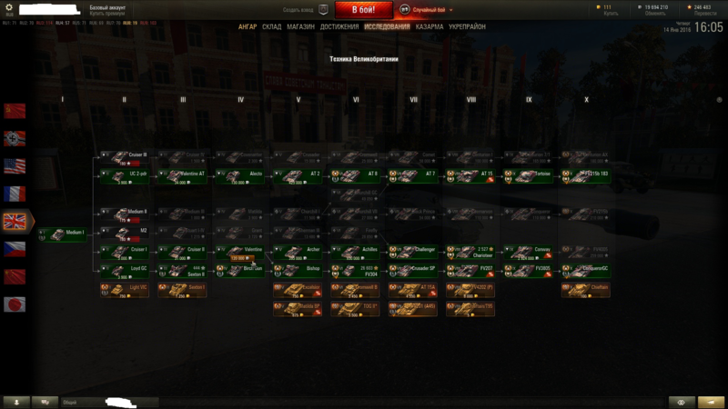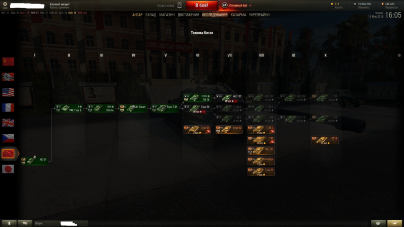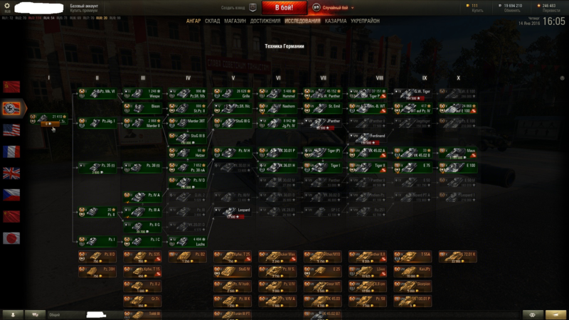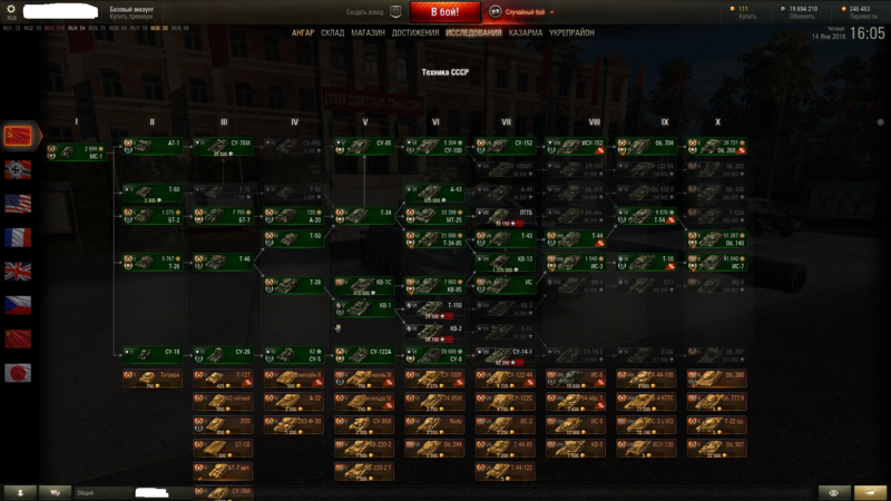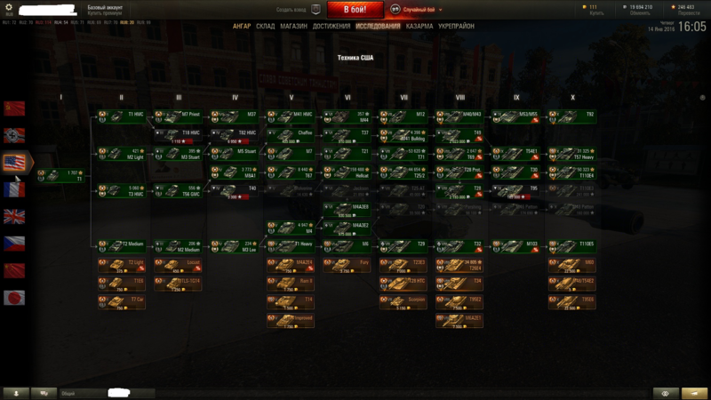В ангаре все рекомендуемые к прокачке топы, огромное кол-во техники иследовано - бери и покупай.