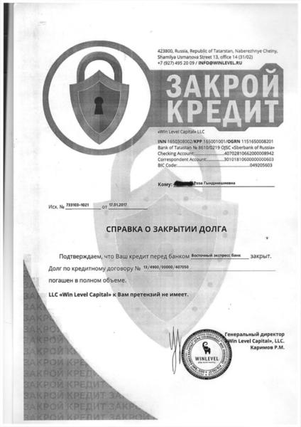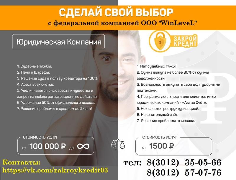 Закрой Кредит, это программа, которая направлена на закрытие просроченных долговых обязательств физического лица у конечного Кредитора за 18~25% от суммы задолженности при необходимости возможно рассрочка на закрытие долговых обязательств, а также займа. По окончанию выплаты представление справок и улучшение кредитной истории. Что получает клиент, обратившись в нашу компанию по программе Закрой Кредит: 1. Стоимость услуги «программы Закрой кредит» 2700 рублей. (с 1-го сентября 2018 года стоимость услуги 3000 рублей) 2. Выкуп долга с дисконтом 75% и более. 3. Комфортную рассрочку на сумму выкупа долга до 2 лет. 4. Передача данных о закрытии долга в КИ (кредитная история). 5. Отзыв исполнительного производства у Судебных Приставов. 6. Справка о «Закрытии задолженности». 7. Улучшение кредитной истории. 8. Дополнительная услуга «Защита дохода» -защита официального дохода или пенсии. 9. Бесплатные онлайн вебинары по программе "Закрой кредит" и как Защитить свои доходы. Тарифы https://vk.com/zakroykredit03?w=product-127849427_1429793%2Fquery Как оплатить за услугу. 1. Зарегистрировать личный кабинет на сайте компании https://winlevel.ru/p/93291 (кнопка быстрая регистрация) 2. Заполнить раздел "профиль". 3. Пополнить лицевой счет личного кабинета в разделе "финансы". через : Сбербанк или любой банк РФ в Салонах сотовой связи МТС, Билайн, Связной, Евросети. 4. Оплатить за услугу в разделе "reestr" 2700 рублей. (указываем офис обслуживания 14807, г. Улан-Удэ, ул. Ленина 30а, офис 15) . 5. Заполняем данные в разделе "Reestr" данные кредитных организаций тел: 8 (983) 435-05-66 Подробнее в группе https://vk.com/zakroykredit03 -