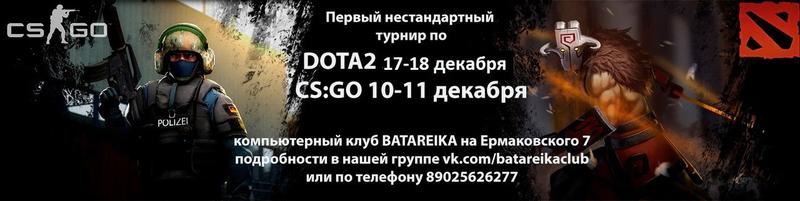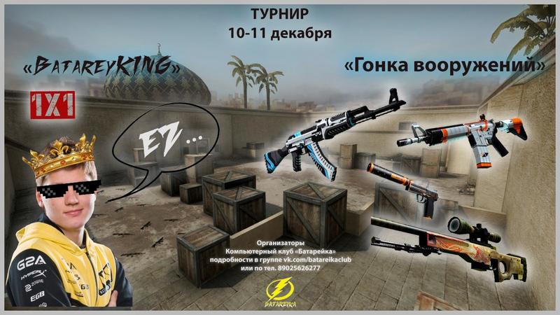 Компьютерный клуб "Батарейка" приглашает вас принять участие в турнирах по Counter-Strike:Global Offensive Aim 1x1 и Гонка вооружений. Правила участия узнайте в нашей группе ВК https://vk.com/batareikaclub.
