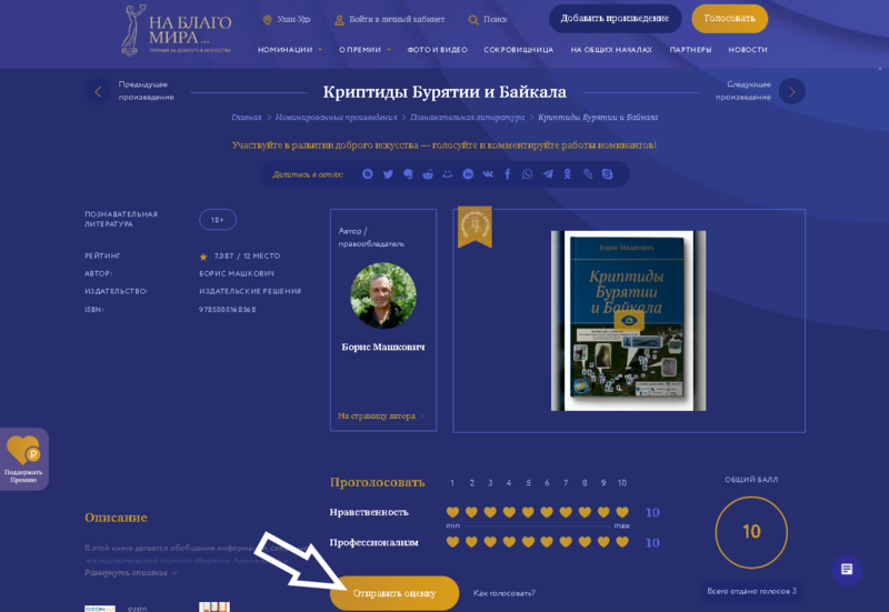Дать оценку и оставить отзыв о книге «Древние тайны...» на сайте: https://nablagomira.ru/vote/proza/drevnie-tainy-buriatii-i-baikala-ot-artefaktov-do-megalitov предварительно авторизуйтесь через соцсеть или по телефону (SMS получите с кодом). Если оценка прошла появиться сообщение "Ваш голос принят..."