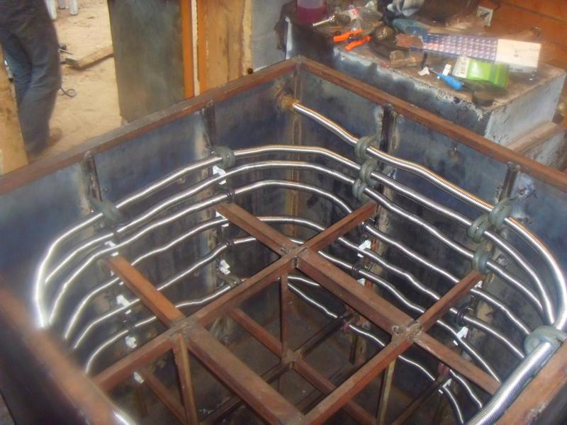 ТА у меня открытого типа, поэтому на счет крышки не заморачивался, выгнул лист немного конусом, и заварил по периметру, а от конуса вывел патрубок на расширитель, надо будет попасть во внутрь вырежу болгаркой, гофра 25, бухта 30 м, ТО сделал один, на ГВС не стал заморачиваться пока, в дальнейшем есть мысль сделать 3 ТО включая солнечные коллекторы, обратка заходит с низу, воскресенье буду делать пробный запуск, сегодня все до утеплял, заполнил систему, хочу еще переделать немного ПВ в котле, да и почистить после весны