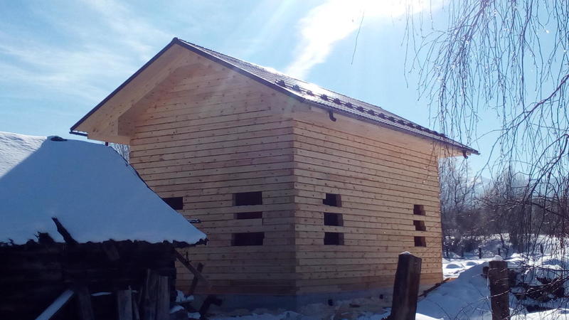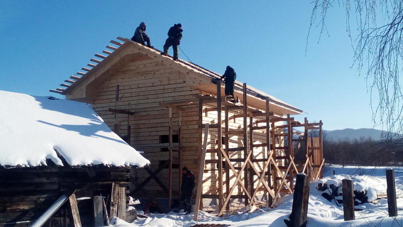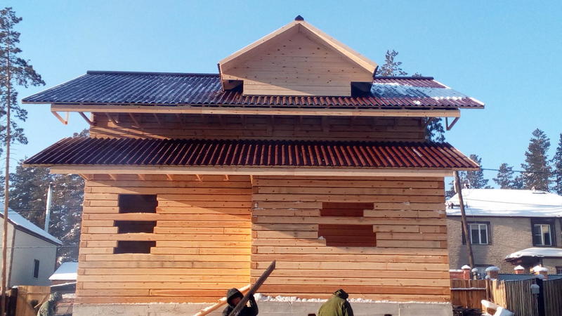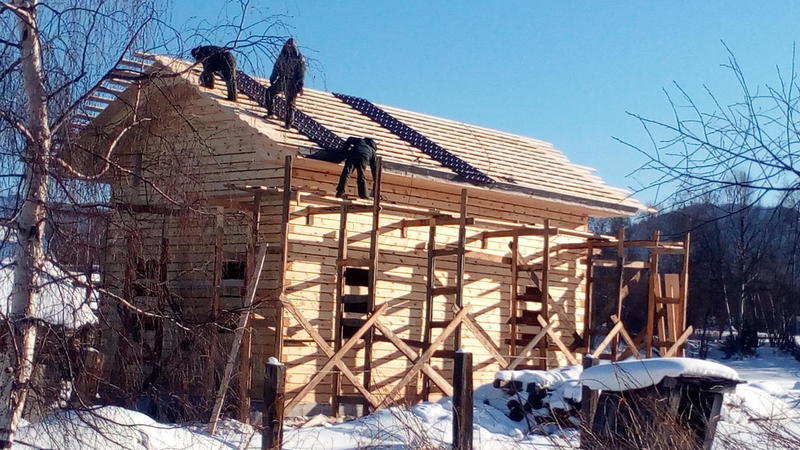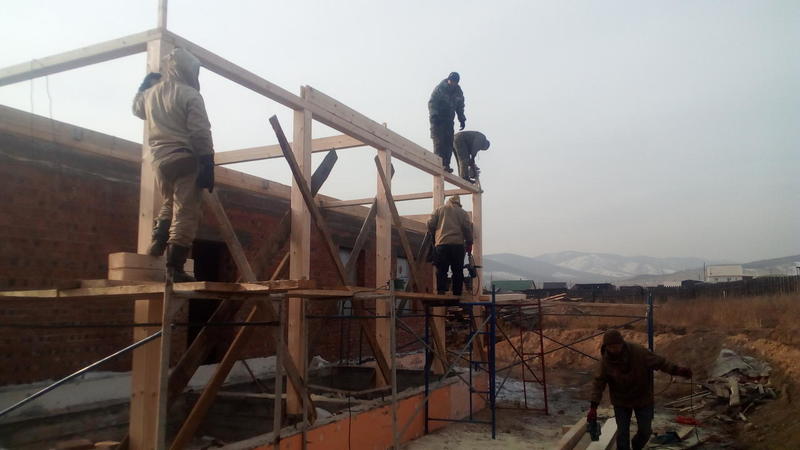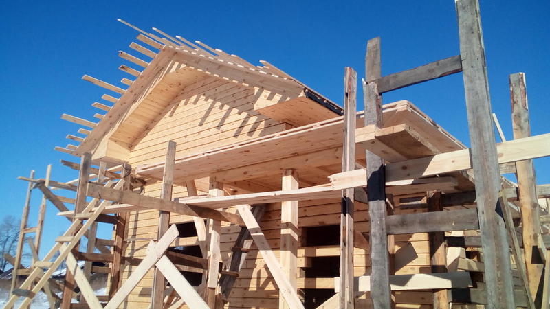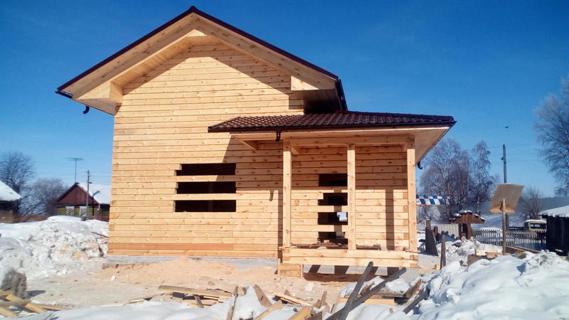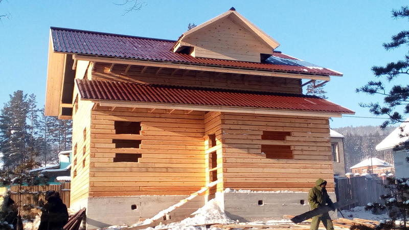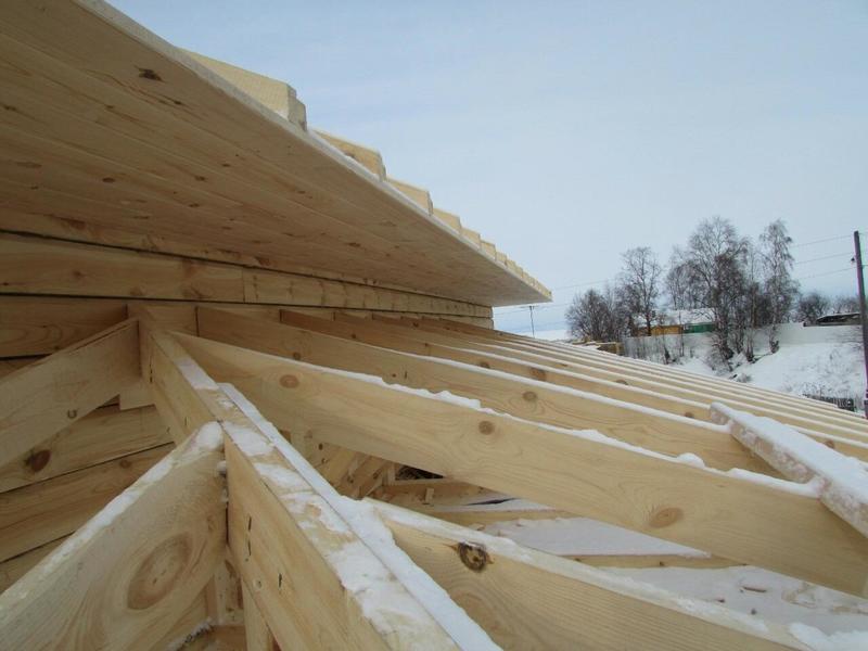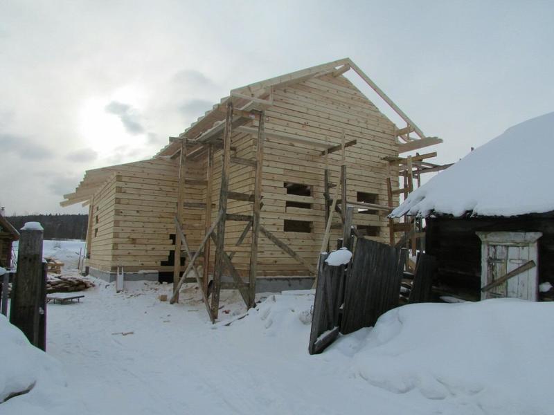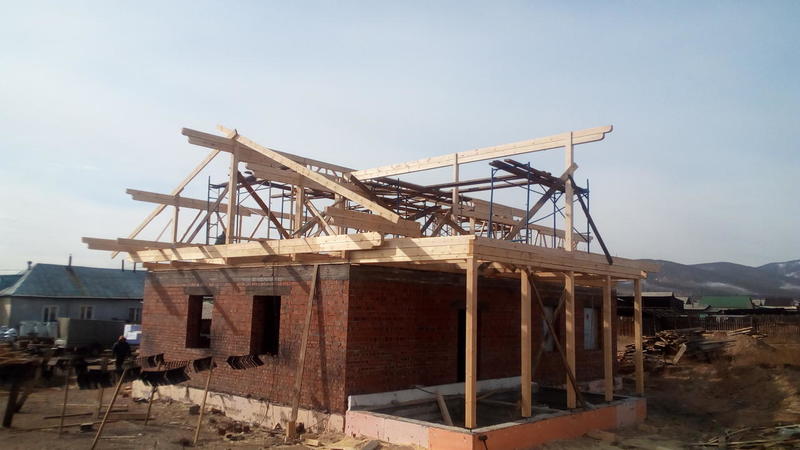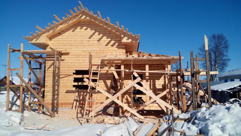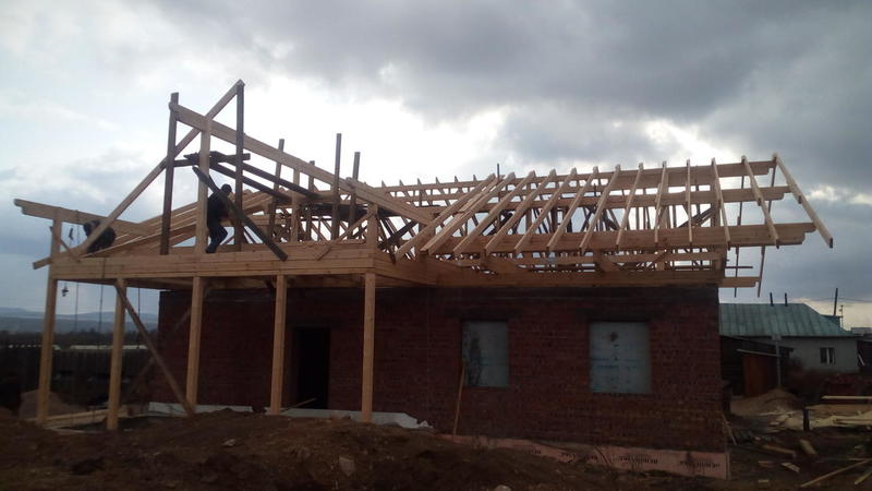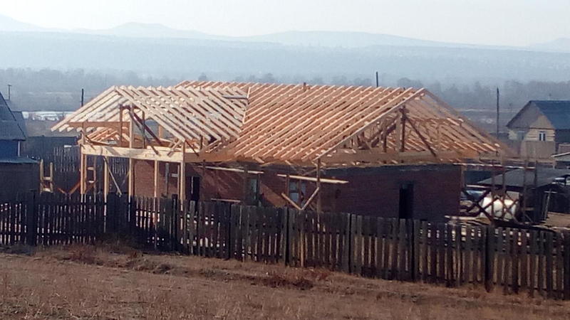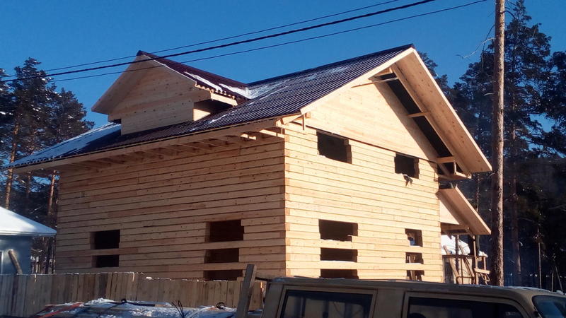Идет стройка в Танхое. Входящий в моду полутораэтажный дом. Только фронтоны - каркасные, в отличие от классического варианта, где фронтоны брусовые. Применение такой технологии (каркасные фронтоны) дает более предсказуемый результат - нет скользящих стропил, крыша статичная, ничего не зависает и т.п.