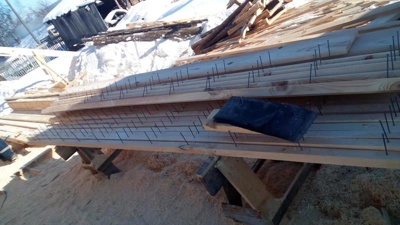 Выпуск коневой балки, состоящей из двух брусьев, стянули шпилькой, выровняв концы брусьев, и скрепили шурупом с головой под ключ (а народе именуются "глухарями"), предварительно просверлив в верхнем брусе отверстие под "глухарь" - чтобы не завис верхний брус при усушке. Так как стропила имеют длину в 7,5 метров. а ширина дома составляет 10 метров, то стропила нуждаются в промежуточном подпоре. Эту функцию выполняют фермы-прогоны, опирающиеся на внутренние несущие стены (через ж/б плиты перекрытия, конечно же). Стропила состоят из двух досок, срощенных в длину при помощи накладки из доски того же сечения. Между накладкой и доской проложен джут в два слоя - это задел для будущего утепления скатов кровли (при обустройстве мансарды). Эта мера предотвращает промерзание через щели между досками стропил и накладок. Так как стропила были выставлены в строгие линии при помощи натягиваемых нитей, то в целях поддержания такого геометрического порядка 😉 нами производится калибровка доски для обрешетки. В результате поле обрешетки будет создавать ровную плоскость. Далее по обрешетке будет укладываться OSB-3 - основание для гибкой черепицы. -