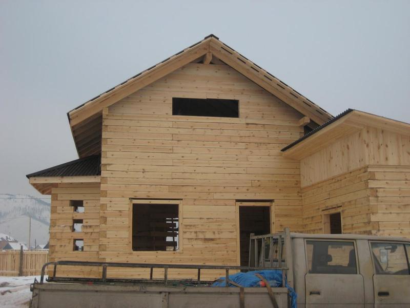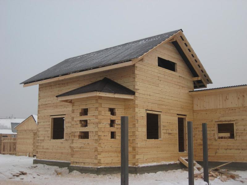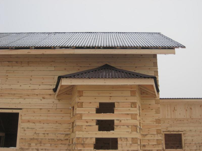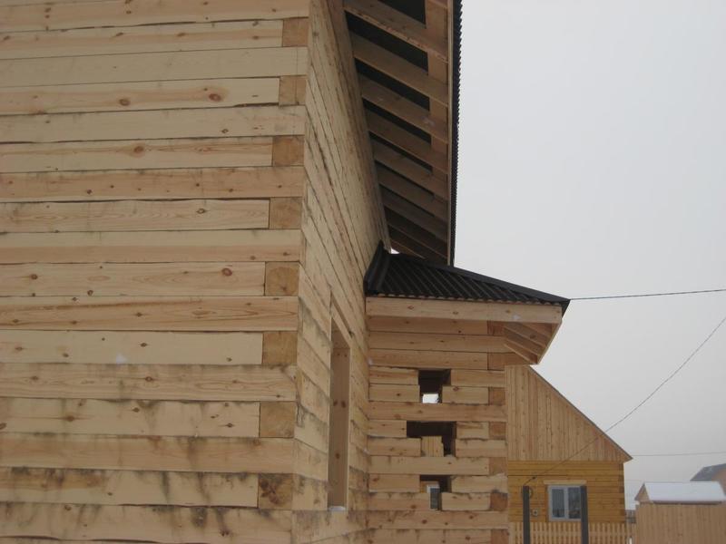 Про скидку на кровли я погорячился... сказали, что завод заказы не принимает... видимо, перешли в режим ожидания из-за роста цен... Вот, ту крышу собрали... листы Нулайна пробивали в каждую волну, это делалось для того, чтобы высота каждой волны была одинаковой (на таких кровлях при боковом ракурсе бывают заметны выступы отдельных волн и кровля смотрится неоднородно), а чтобы промороженная доска обрешетки не лопнула вдруг, колотили гвозди вразбежку с разницей 6 см (ширина строительного уровня, при помощи которого и делали разметку под гвозди), отверстия под гвозди просверливали на земле - это делает процесс забивания гвоздей более удобным - вставляешь гвоздь и колотишь одной рукой. Обрешетка выравнивалась в плоскость с помощью саморезов с полной резьбой (мы их называем регулировочными) и прямолинейной срощенной в длину ската доски в качестве правИла. С коробкой дома в дальнейшем ожидаются проблемы с конопаткой... собран, как сейчас модно, на ленточный уплотнитель в один слой... брусья сожмутся напрочь, а слой пакли сам по себе неравномерный, с пустотами... и надо будет забивать паклю в швы, в которые не будет проходить даже лезвие ножа... Брус на этом доме отстроган изнутри и снаружи, но фаска на наружной грани бруса не снята... а она защищает от дождей швы - предохраняет от намокания межвенцовый уплотнитель. Ну и строганный брусовой фасад потребует в дальнейшем немало денег на отделку, если конечно делать все правильно... а еще учитывая, что дома все сейчас утепляются снаружи... Также возможны проблемы в будущем с нижним венцом. Он из соснового бруса и не обработан. Но лежит на рубероиде... Тут важна защита от дождевой влаги, которая может скапливаться на рубероиде. С отделкой фасадов полка эта закрывается отливами, но до того времени все равно необходима защита. Можно установить временные отливы из того же рубероида, предварительно промазав места соприкосновения битумным лаком. Вообще, я бы настоятельно рекомендовал очень серьезно подходить к этому вопросу (касаемо нижних венцов). Представьте себе, что вы отделали все помещения, например евроремонтом, отделали фасады, угрохав в это немало денег, а через, например, 5-6 лет обнаруживаете, что у вас в подполье плесень... и нижний венец подгнил уже... Будь у вас просто изба, тут нет проблем - приподнял дом и заменил венцы. Поэтому рекомендую применять на нижние венцы брус только из лиственницы, и желательно уже высушенной на момент начала стройки, чтобы качественно ее всю обработать перед укладкой.