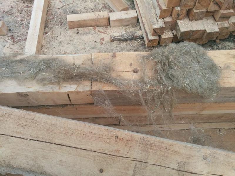 Причем паклю на этот пятачок я собрал примерно с двух погонных метров уже уложенной ими пакли...(( А верхний брус мы снимали, чтобы показать уложенный слой пакли - он еще не был пронагелен... (оно и понятно - попробуй-ка просверлить через достаточный слой пакли - намотаешь ее всю на сверло...).