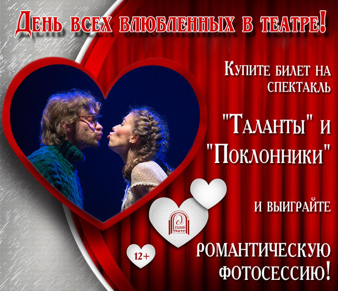 В День всех влюбленных – в театр! Где романтично провести День всех влюбленных? Ответ только один – в театре! Где можно сидеть рядом в темноте и держать за руку любимого, и при этом не слышать хруст попкорна? Куда еще в зимний холодный вечер позволяется надеть вечернее платье или элегантный костюм? И как очаровать спутника или спутницу знаниями о культуре и искусстве, демонстрируя вкус и интеллект. К тому же в этот день только здесь можно выиграть фотосессию в студии Сергея Примакова и множество других подарков! 14 февраля в Русском драматическом театре вас ждет премьерный спектакль Артема Баскакова «Таланты» и «Поклонники» по пьесе А. Н. Островского. В фойе влюбленные смогут сфотографироваться в специально организованной тематической фотозоне, создающей атмосферу любви и нежности. И, самое важное, – среди купленных билетов будет проведен розыгрыш фотосессии в студии театрального фотографа Сергея Примакова, а также других призов от сети магазинов прикольных подарков (генеральный директор Дазаева Лариса Михайловна). Билеты на спектакль можно приобрести в кассе театра и на сайте http://ulan-ude.kassy.ru/event/102476/ Телефон кассы: 23-50-10