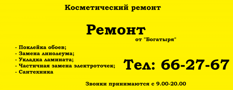 1. Косметический ремонт квартир от "Богатыря": - Поклейка обоев; - Замена линолеума в помещении; - Частичная замена электроточек; - Частичная замена сантехники; - Замеры бесплатно. Договор, гарантия. Тел. 66-27-67