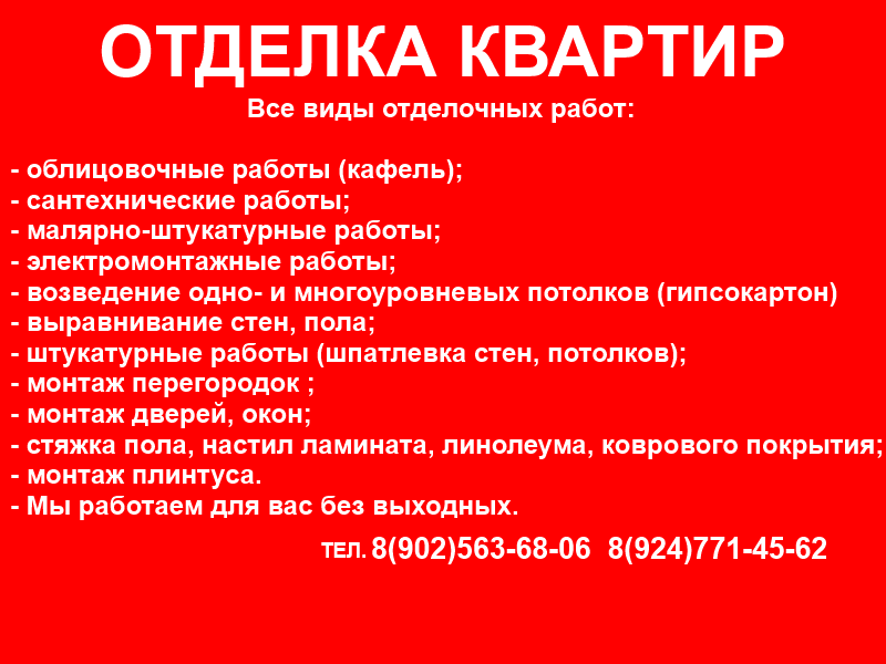 Все виды отделочных работ: - облицовочные работы (кафель); - сантехнические работы; - малярно-штукатурные работы; - электромонтажные работы; - возведение одно- и многоуровневых потолков (гипсокартон, натяжные); - выравнивание стен, пола; - штукатурные работы (шпатлевка стен, потолков); - монтаж перегородок ; - монтаж дверей, окон; - стяжка пола, настил ламината, линолеума, коврового покрытия; - монтаж плинтуса. Мы работаем для вас без выходных. 8(902)563-68-06 8(924)771-45-62