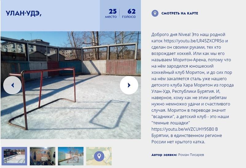 12 ноября 2016 года полностью отреставрированный каток в г. Улан-Удэ на ул. Ключевская, 20 уже примет всех любителей хоккея с шайбой и фигурного катания. На площадке во дворе жилого дома будет расположена современная стандартная хоккейная коробка размером 20*40 метров, с пластиковыми бортами. Также, в рамках мероприятий 12 ноября депутатом Народного Хурала Республики Бурятия, Председателем Правления компании «Славия-Тех» Андреяном Геннадьевичем Зыбыновым, будет передана в дар детской хоккейной команде "Хара Моритон" современная раздевалка и помещения для тактических занятий по адресу ул. Ключевская, 18. В мае 2016 года каток хоккейного клуба «Моритон» в городе Улан-Удэ стал победителем конкурса Nivea «Голосуй за свой каток» по реконструкции старых катков. Nivea уже третий год возрождает непригодные для катания ледовые площадки в рамках вышеуказанной программы. Это и объединило жителей Улан-Удэ в общее дело, что поспособствовало победе нашего катка. По итогам голосования и конкурса заявка Хоккейного клуба «Моритон» и детской команды «Хара Моритон», была признана лучшей и объявлена победителем конкурса "Голосуй за свой каток!" от г. Улан-Удэ с 11927 голосов. «До участия и победы нашей детской команды в конкурсе NIVEA «Голосуй за свой каток», наши дети были лишены возможности прикоснуться к современным хоккейным площадкам. Наши юные хоккеисты команды «Хара Моритон» были вынуждены выживать на обветшавшей и уже не подвергавшейся очередному ремонту площадке. К сожалению, в последнее время в Бурятии были сделаны лишь шаги назад в детском хоккее с шайбой. Если мы своей деятельностью помогаем вытащить с улицы хотя бы одного мальчишку и даем ему коньки, клюшку, возможности для тренировок, который из-за этого выберет не преступность и наркотики, а спортивную секцию, можно считать, что мы внесли свой вклад в интересах всех жителей Бурятии. — рассказывает автор победной заявки Роман Писарев, Президент хоккейного клуба «МОРИТОН». — Благодаря тому, что компании NIVEA небезразлична судьба таких площадок по всей России, наш каток получил новую жизнь! На новом катке мы сможем открыть некоммерческую детскую секцию хоккея и взять на себя заботу и ответственность по созданию дворовых команд и развитию детского спорта. Это отличный подарок на Новый Год, который мы сделали себе сами вместе с NIVEA. Одна из ключевых идей, которую мы с командой пытаемся развивать, – это доступный хоккей для всех, который должен приносить не только результаты и коммерческую выгоду, но и пользу людям». 12 ноября на торжественном открытии хоккейной площадки пройдут показательные выступления детских хоккейных команд "Хара Моритон" и "Восток", коллективов фигуристов из Улан-Удэ и Читы, будут организованы конкурсы для зрителей, мастер-классы по игре в хоккей с шайбой. В числе первых гостей катка ожидаются Мария Петрова и Алексей Тихонов, чемпионы мира (2000 год), двукратные чемпионы Европы (1999, 2000), чемпионы России (2006 год) по фигурному катанию. Ждем всех на открытие! Начало мероприятия с 13:00