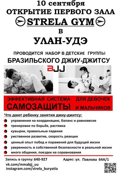 В зале единоборств STRELA GYM начинает набор в детские группы по бразильскому джиу джитсу.Дни и время тренировок вы можете узнать по тел: 640-927. Также, по этому номеру вы можете задать любые интересующие вас вопросы.