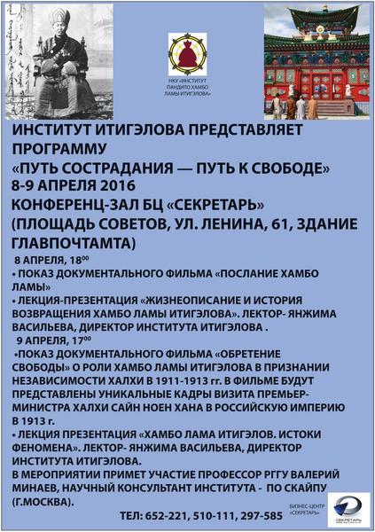1 февраля в бизнес-центре "Секретарь" состоялась пресс-конференция "Пандито Хамбо Лама Итигэлов и наши дни" при информационной поддержке ИА «Восток-Телеинформ». В пресс-конференции приняли участие: Васильева Янжима Дабаевна - директор "Института Хамбо ламы Итигэлова", Морихиро Ивата - Художественный руководитель Бурятского академического театра оперы и балета, Фетисов Сергей Кузьмич - директор филиала РГГУ в г. Улан-Удэ, Хачатуров Александр Евгеньевич - профессор Российского химико-технологического университета им. Д.И. Менделева (по скайпу), Мешкова Анжелика Викторовна - Директор «Восток-Телеинформ», член Союза журналистов. В ходе пресс-конференции дали подробную информацию о поездке сотрудников Института Хамбо ламы Итигэлова в Японию на остров Садо, для участия в переговорах с ансамблем "Кодо" по вопросу создания музыки к балетному спектаклю "Благославление Трех Драгоценностей" о Хамбо ламе Итигэлове, который поставит в Бурятии балетмейстер театра оперы и балета Морихиро Ивата, также о некоторых научных исследованиях феномена Хамбо ламы Итигэлова и об издании книги "Пандито Хамбо лама Итигэлов. Смерти нет" на монгольском языке и о работе по изданию книги на английском языке. Следите за новостями нашей группы и Вы всегда будете в курсе предстоящих событий и встреч))) Ваш Бизнес-центр "Секретарь", тел: 297-585 и 510-111