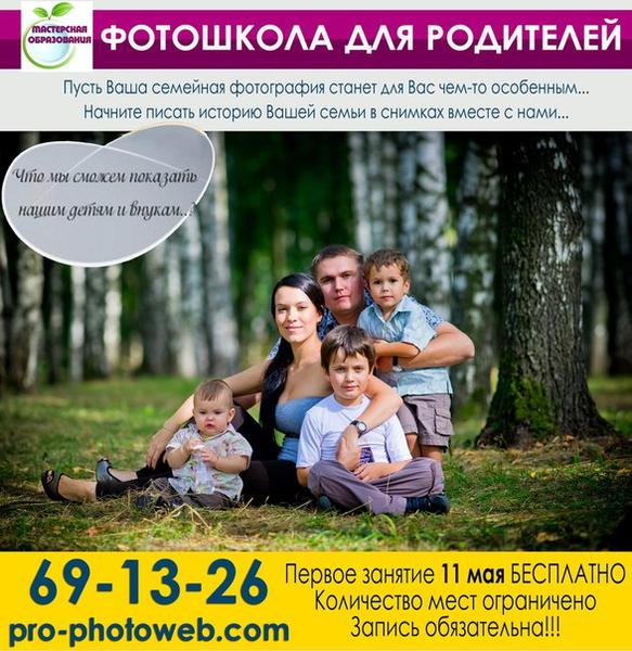Семейные фотографии давно отличаются особой атмосферой и энергетикой. Настоящие, яркие, эмоциональные и в то же время трогательные и душевные- они притягивают своей искренностью! Но чтобы получить качественные фотографии нужно обращаться к профессиональным фотографам и платить большие деньги... Но теперь в нашем Бизнес-центре "СЕКРЕТАРЬ" появилась необычная Фотошкола для родителей, где Вас научат не только как правильно пользоваться фотоаппаратурой, но и к концу обучения у Вас уже будет первое Ваше портфолио. Приходить на обучение можно вместе с детьми. Пока вы учитесь, ребятишки могут поиграть в небольшой игровой зоне. А также мы пригласили наших друзей и партнеров, которые не дадут заскучать детям от Детские праздники "Мармелад" и Детская футбольная школа "Форвард" Улан-Удэ Количество мест ограничено!!!Записаться необходимо по тел.: 691326