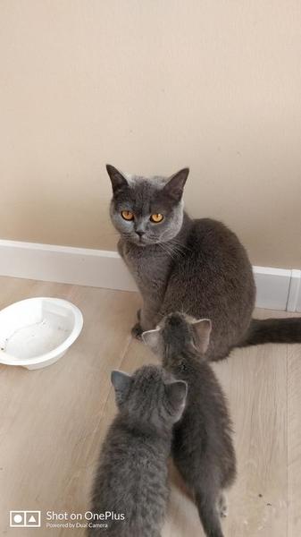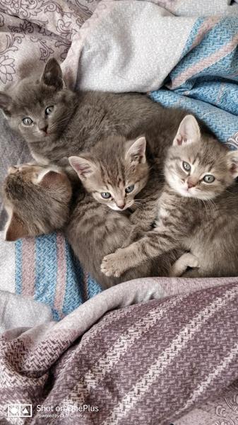 Котята все серые(один очень серый, прям как мама, остальные посветлее с белыми проплешинами)