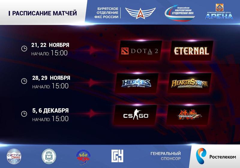 Всероссийская киберспортивная студенческая лига (или просто – Студенческая лига) – это соревнования сборных университетов, которые организованы Федерацией компьютерного спорта России и проводятся в течение всего учебного года. Участниками 2 сезона киберспортивной студенческой лиги стали: БГУ, БГСХА, ВСГУТУ, СибГУТИ ВУЗы прошли внутривузовский отбор по 6 программам: Dota 2, Сounter-Strike Global Offensive, Hearthstone, Heroes of the Storm, Eternal, Tekken 7. Тем самым сформировали сборную вуза от 18 - 36 человек. Следующий этап межвузовские соревнования на выявление сильнейшего вуза по Республике Бурятия. Затем сильнейший вуз участвует на зональном этапе в формате ЕСНУП (единые соревнования на удаленных площадках) против сильнейших вузов Сибири. и Финальный этап в г Москва с сильнейшими вузами федеральных округов. Призовой фонд 2 сезона Всероссийской киберспортивной студенческой лиги 6 000 000 рублей, часть призового фонда получает сам вуз. Жеребьевка: БГУ vs ВСГУТУ БГСХА vs СибГУТИ Расписание: 21, 22 ноября Dota 2, Eternal в 15:00 ч. 28, 29 ноября Heroes of the Storm, Hearthstone в 15:00 ч 5, 6 декабря Сounter-Strike Global Offensive, Tekken 7 в 15:00 ч В прошлом сезоне студлиги: Участниками были БГУ, БГСХА, ВСГИК, СибГУТИ. Победитель регионального этапа: БГУ В зональном этапе по СФО БГУ заняли 3 место Призовой фонд на финале г Москва составлял 7 000 000 рублей организатор Бурятское региональное отделение "Федерация компьютерного спорта России" - https://vk.com/resf03 генеральный партнер ПАО "Ростелеком" - https://vk.com/rostelecom.buryatia технический парнер компьютерный клуб "Арена" оф сайт студлиги: http://студлига.рф Прямую трансляцию на Вконтакте: https://vk.com/resf03https://www.youtube.com/watch?v=9QpjrbFTv-o