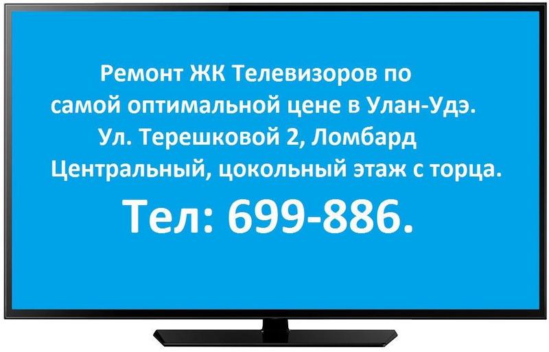 Ремонт ЖК Телевизоров по самой оптимальной цене в Улан-Удэ. ул.Терешковой 2 Ломбард центральный, цокольный этаж, с торца. Работаем пн.-пт. с 10:00 до 18:00, сб. с 11:00 до 16:00, вс. выходной. тел: 89149839546