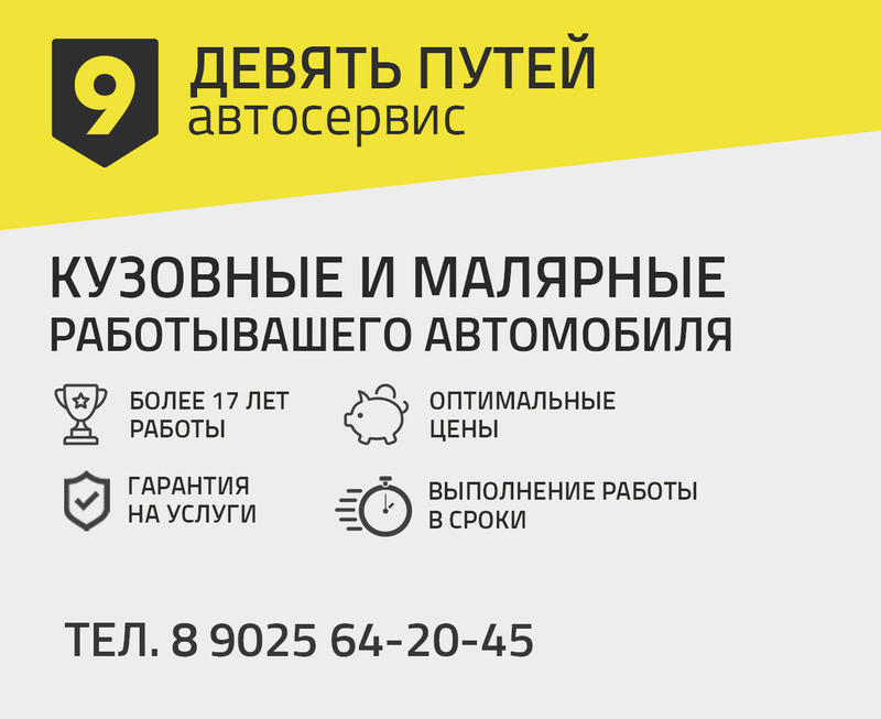 Автосервис "Девять Путей" Кузовные, малярные и сварочные работы вашего автомобиля. Качественная работа, оптимальная цена, в сроки, гарантия! Предоставляем скидки! Звонить по т. 8 9025 642045
