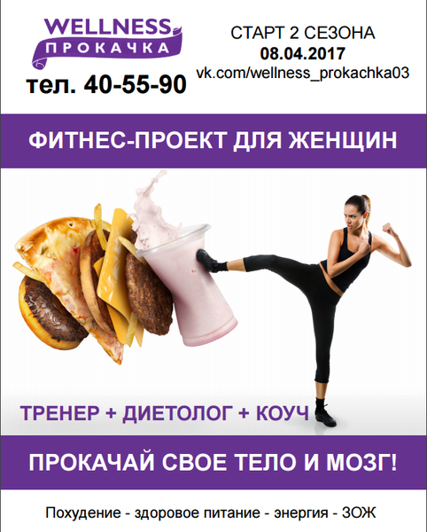 Что такое wellness прокачка ЭТО 9 НЕДЕЛЬ: Позитива, общения, получения новой, интересной и полезной информации о том, как правильно питаться и изменить свои плохие привычки на хорошие!Мы не проект "Худеем за неделю" или "Proсушка". Мы не обещаем,что через месяц вы будете с фигурой Мисс Вселенная. Мы помогаем перестроить культуру питания и ведение образа жизни. Мы не ЗАСТАВЛЯЕМ, а ПОМОГАЕМ ПОМОГАЕМ вернуть Вас в ваш здоровый вес или вес вашей мечты: БЕЗ изнурительных диет БЕЗ применения жиросжигателей, гормонов и прочей химии БЕЗ применения и покупок непонятных и ненужных тренажеров и поясов с лосинами, от которых, якобы, мигом худеют Узнай подробности на сайте http://wellness-prokachka03.tilda.ws/
