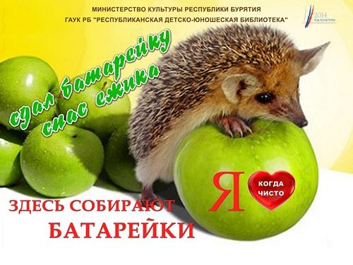 Однажды мы натолкнулись на информацию, что 1 батарейка загрязняет 20 квадратных метров земли. А это – территория обитания 2-х кротов, 1 ежика и множества дождевых червей. В состав батареек входят тяжелые металлы: Ртуть, Кадмий, Свинец, Литий и другие. Эти вещества загрязняют окружающую среду и наносят вред человеку, поэтому, вопрос утилизации батареек стоит крайне остро. При этом данная проблема успешно решается далеко не во всех городах нашей страны. Не везде можно найти пункты приема израсходованных батареек. Средняя семья только за 1 год накапливает до 1кг негодных батареек, выбрасывая их в мусор. Такой мусор отправляется на свалку и начинает загрязнять окружающую среду в результате того, что оболочка батарейки разрушается. Таким образом, ядовитые вещества попадают в почву, медленно уничтожая все живое на земле! Помня о том, что мы все – экологически ответственные люди, наши сотрудники решили объявить акцию «Сдай батарейку – спаси ежика!». К вопросу мы подошли ответственно, и в самом начале позвонили в наше самое главное природоохранное учреждение – Министерство природных ресурсов Бурятии. В результате нашего звонка, мы узнали, что утилизацией батареек в нашем городе, а видимо и в республике занимается предприятие «Байкалэкосервис», находится оно в пос. Сотниково. Прием осуществляется на платной основе: 1 кг. батареек – 40 руб. (уточняем, платят не сдавшему, а как раз наоборот, мы сдаем - мы платим). И, тем не менее, сегодня Республиканская детско-юношеская библиотека объявляет бесплатный сбор отработанных батареек на своей территории – в Центре чтения юношества, по адресу: Ключевская, 23А А ты спас ежика?!