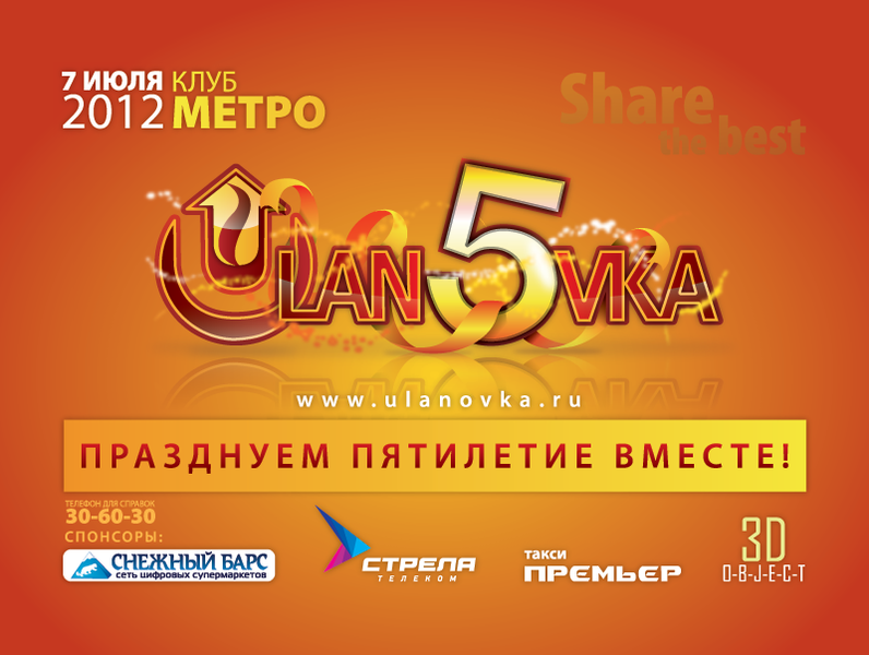 Дорогие друзья! Совсем скоро случится очень значимое для всех нас событие. 7 июля мы празднуем ровно пять лет со дня создания Улановки и практически совпавшую с этой датой регистрацию 50 000-го участника, которым стал пользователь @вселенная! По такому поистине грандиозному поводу 7 июля в субботу в клубе Метро мы проводим юбилейную вечеринку! Целых два года мы ждали этого, и осталось совсем недолго до того момента, когда мы все вместе встретимся вновь, чтобы познакомиться поближе и отпраздновать наш общий праздник в кругу друзей! Приглашаем всех вне зависимости от пола, национальности, семейного положения и отношения к сборной России по футболу! Если Вы пользователь Улановки - это Ваш праздник! Клуб Метро откроет свои двери для Вас в 21.00. Начало официальной части запланировано на 22.00. В официальной программе мероприятия поздравления, викторина, конкурсы, призы, выступления артистов, КВН, стриптиз и, конечно же, огромный праздничный торт! А после официальной части свободный танцпол до самого утра! Билеты поступят в продажу уже завтра. Предварительно желательно уточнить наличие билетов по телефону 30-60-30. Приобрести их можно будет в магазине Street Style по адресу ТЦ Столичный, 2 этаж, бутик 47 по цене 200 рублей. Также билеты можно будет приобрести на входе непосредственно перед вечеринкой. Стоимость билета на входе 250 рублей. Правила участия На входе каждому пользователю будет выдаваться бейджик с ником на форуме - клейкий стикер, на котором Вы сможете маркером написать свой ник. Также Вы можете сделать себе бейджик самостоятельно и принести его с собой; На вечеринке крайне приветствуется неформальное общение и знакомство с другими пользователями. Не стесняйтесь знакомиться, а все форумные обиды и споры оставьте за дверями клуба Мы обращаем Ваше внимание на то, что вход в клуб разрешен лицам старше 18 лет. Гости вечеринки Ринчин Дашицыренов Группа "Хатхур Зу" Adrenalin Crew Спонсоры вечеринки компания Снежный барс провайдер Стрела Телеком такси Премьер компьютерный клуб 3D Object Праздничные обои на рабочий стол 1024x768 1280x800 1280x1024 1366x768 1440x900 1680x1050 1920x1080 Юзербар для установки в подпись на форуме [url=http://ulanovka.ru/forum/viewtopic.php?t=323561][img=https://ulanovka.ru/uploads/images/5years_userbar.png][/url] Предлагаем желающим заранее забронировать столики на вечеринку Красным отмечены столики, занятые организаторами, спонсорами и артистами. Остальные свободны для платной брони. Цены символические: Большие и средние столики по 300 рублей; Маленькие (13-19) по 100 рублей. Столики вмещают минимум 4 человек. Для бронирования удостоверьтесь, что желаемый столик еще не занят (начиная с этого поста и ниже) и затем отпишитесь в этой теме. Если Вы желаете выступить на вечеринке, просьба заранее связаться с организаторами (@Mac, @Mosk) В программе мероприятия возможны изменения. Обновления темы: 19.06.12 - Добавлены обои на рабочий стол 03.07.12 - Добавлен юзербар для форума 05.07.12 - Добавлены гости вечеринки 06.07.12 - Добавлена информация о бронировании столиков