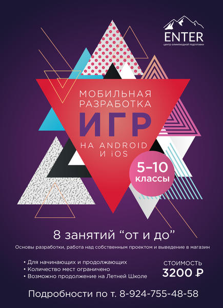 Приглашаю школьников 5 - 10 классов на курсы по разработке мобильных игр на Android и iOS. На курсе мы ознакомимся с игровым движком Unity, спроектируем мобильную игру по вашей идее и реализуем её на одной из платформ для вывода на AppStore или Google Play. Вопросы можно задавать по номеру телефона на постере или здесь в теме, буду рад проконсультировать по курсу и ответить на ваши вопросы.